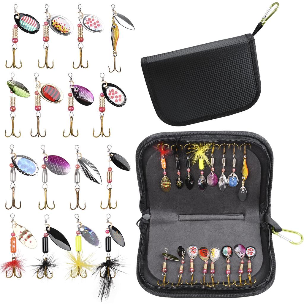 Specifications: Set of 16 spinner lures in various sizes, shapes, and colors (15 lures total, 5.5cm-5.99cm, 2.2g-4.2g, and 1 lure, 8cm/12.3g). Includes a lure wallet for easy portability and management.