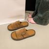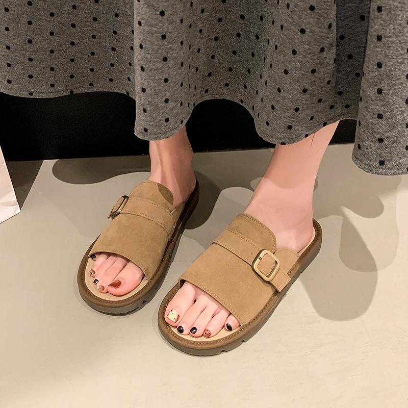 Fashion 2025Women's Flat Sandals Summer New Style Round Head Open Toe Cow Suede Metal Buckle Soft Sole Anti-slip Wear-resistant Slippers