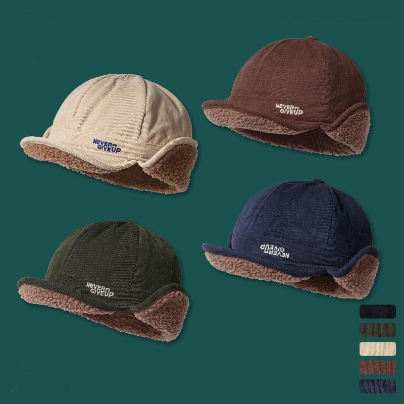 Retro Corduroy Lamb Wool Thickened Warm Ear Protection Women Winter Cute Wool Hat Men