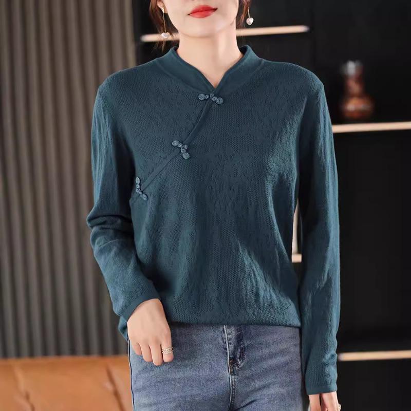 New Medium and Retro Buckle Sweater Women's Diagonal Placket Stand-up Collar Solid Color Temperament Bottoming Knitted Sweater Women