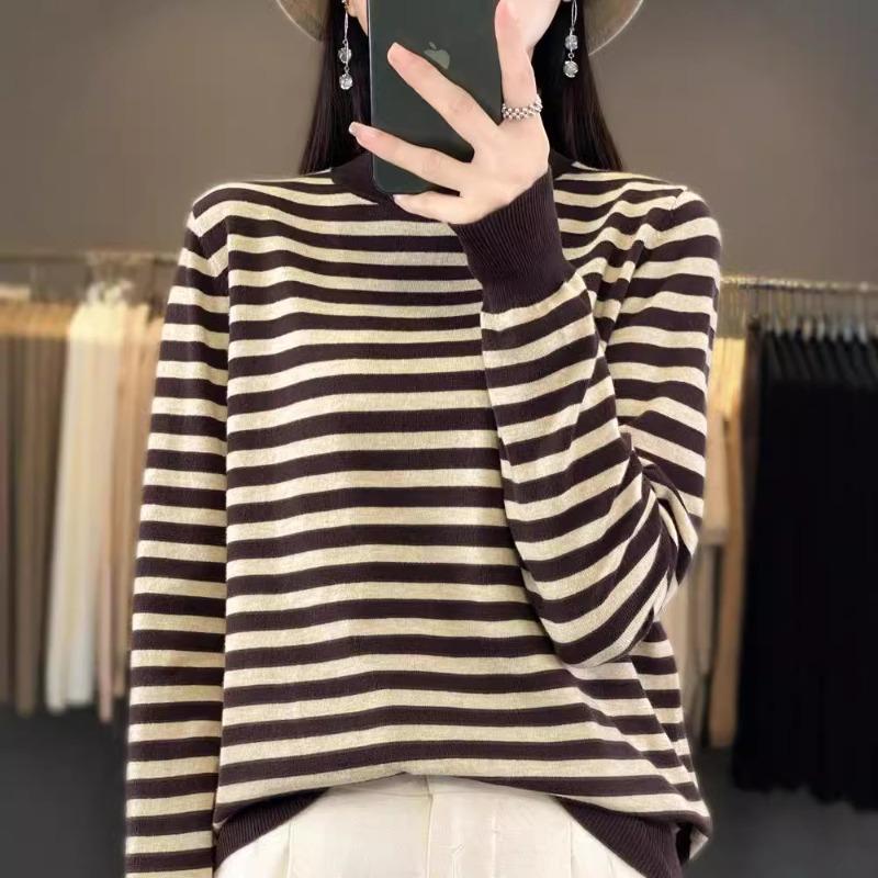 24 Spring Striped Semi-turtleneck Knitted Shoulder Sleeve Bottom Shirt Loose Versatile Pullover Long Sleeve Top