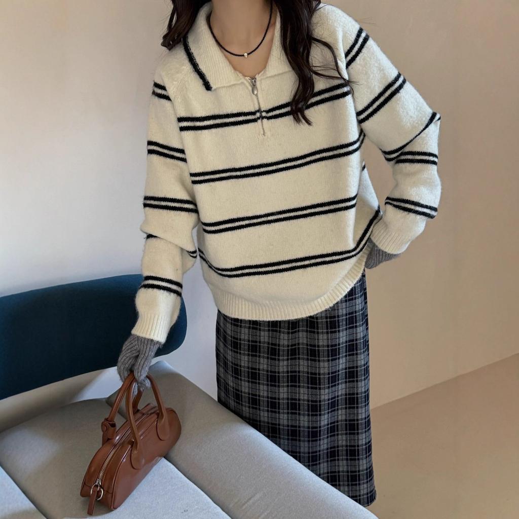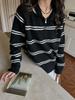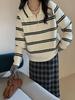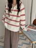 Lapel Color Matching Striped Pullover Sweater Women's Autumn and Winter New Loose and Versatile Knitted Sweater Top