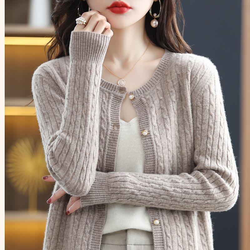 Spring and Autumn Cardigan Women's Crew Neck Twist Knitted Loose Versatile Solid Color Breasted Sweater Jacket