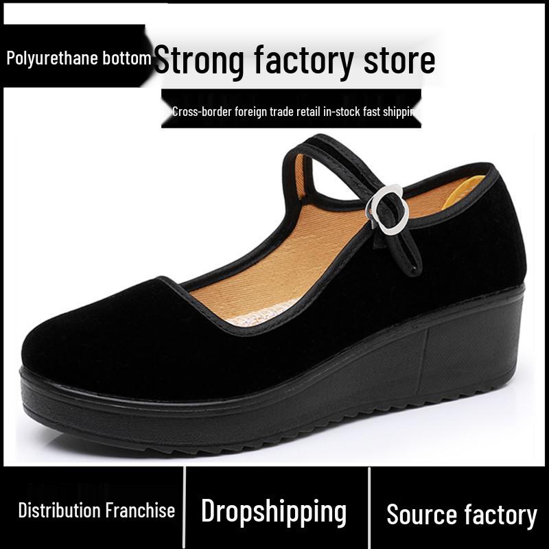 Polyurethane Sole Women's Black Cloth Shoes - Flat and Wedge Heel with One Strap for Work or Dance
