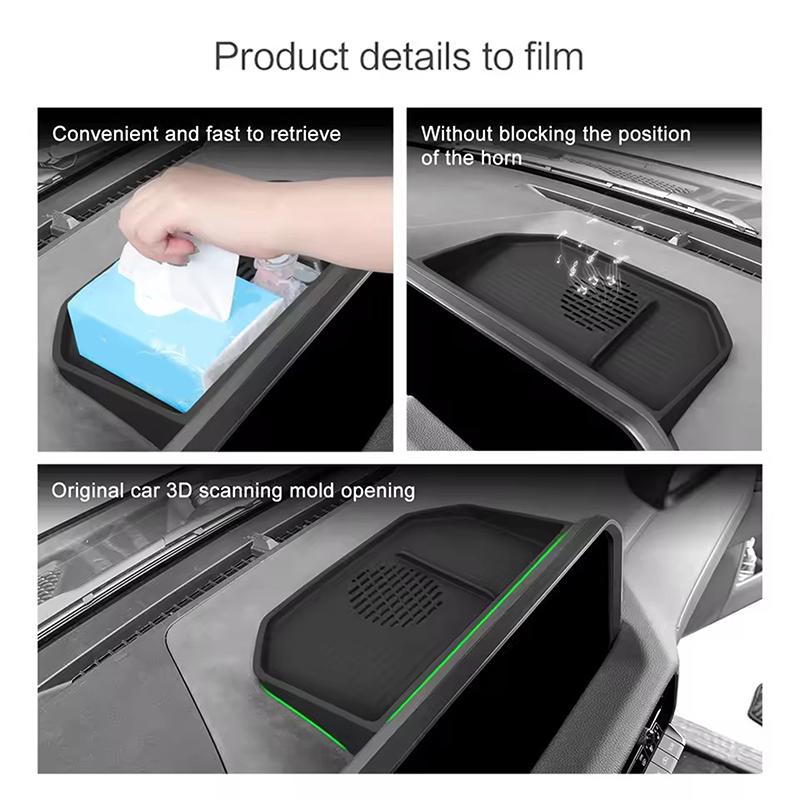 3. Features]: The original vehicle data is used for manufacturing, ensuring a perfect fit between the product and the vehicle. The reserved holes will not cover the button positions and will not affect the phone charging. It can effectively utilize the space, increase the storage space for the driver's seat and passenger's seat, and can store small items such as mobile phones, wallets, cigarettes, cards, keys, coins, etc., keeping the center control of your vehicle clean and tidy.