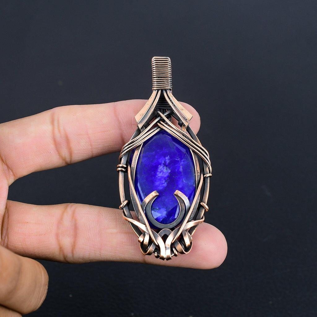 Blue Sapphire Pendant, Handmade Gemstone Pendant, 999 Copper Wire Wrapped Pendant Antique Jewelry, For Engagement Gift