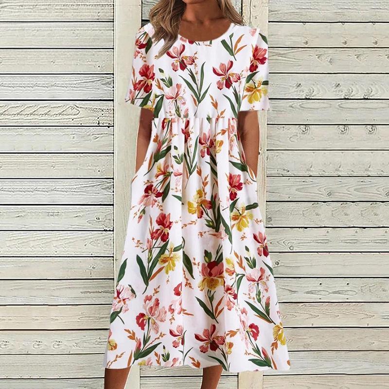 Women's Fashion Summer Spring Flower Pattern Print Short Sleeve O-Neck Middle Waistline Casual Dresses