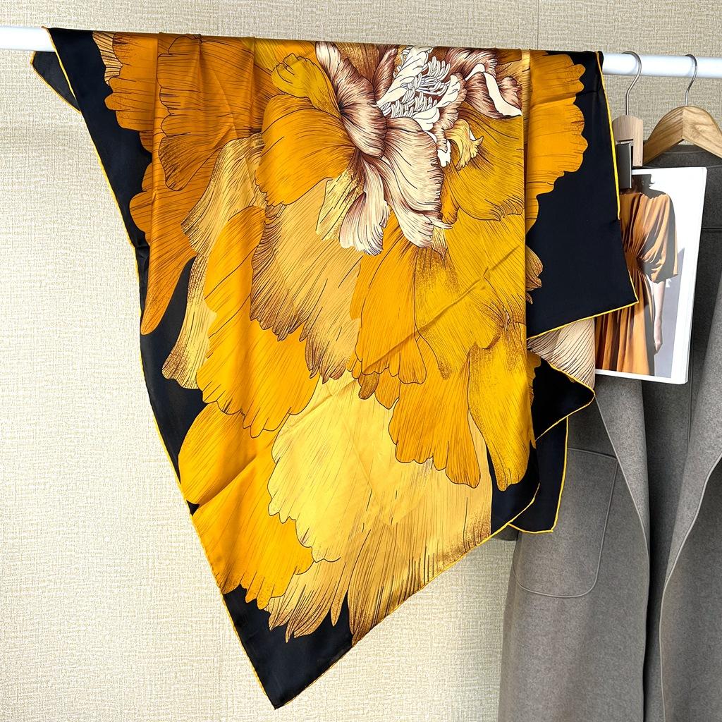 100% Silk Silk Mulberry Silk Black Yellow Peony Square Scarf Silk Scarf Women'S Spring And Autumn Decorative Scarf Shawl