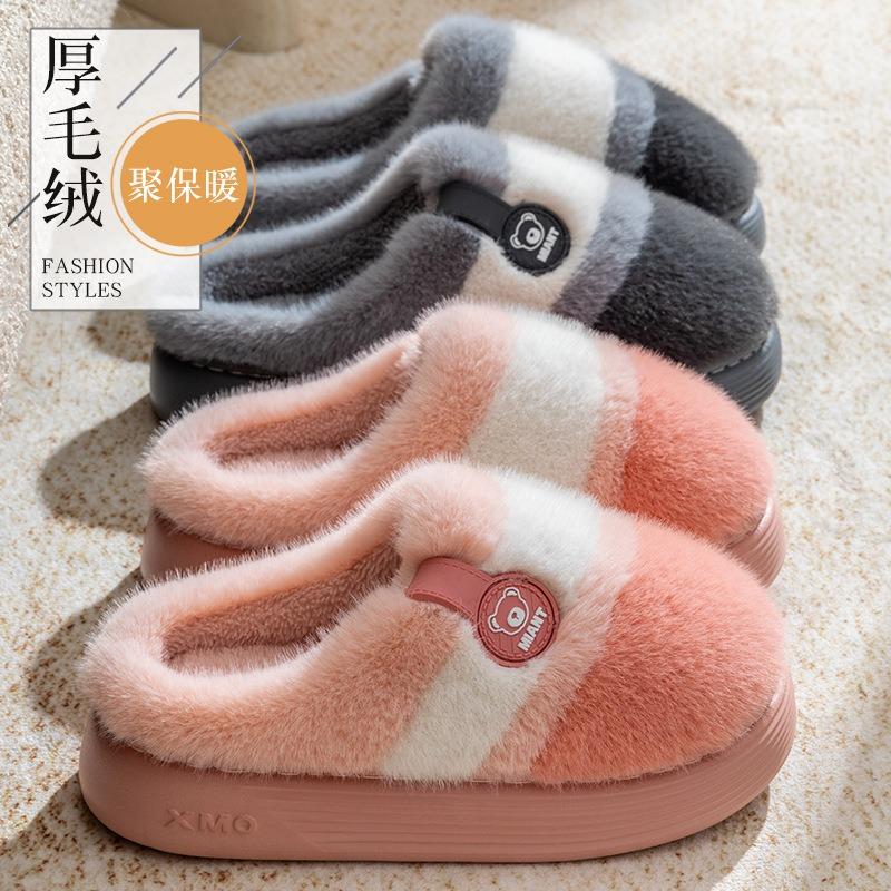 New V Cartoon Thick-soled Warm and Non-slip Couple Cotton Slippers Home Plush Lightweight Silent Indoor Cotton Shoes Men