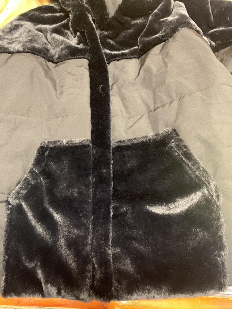 Women's Light Gray Quilted Hooded Winter Coat with Faux Fur Trim and Ribbed Sleeve Detail