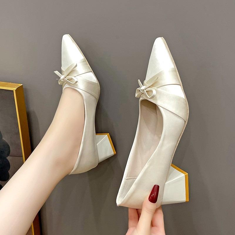 Temperament Satin Pointed Thick Heel Doudou Shoes New with Skirt Sweet Bow Light Mouth Single Shoes