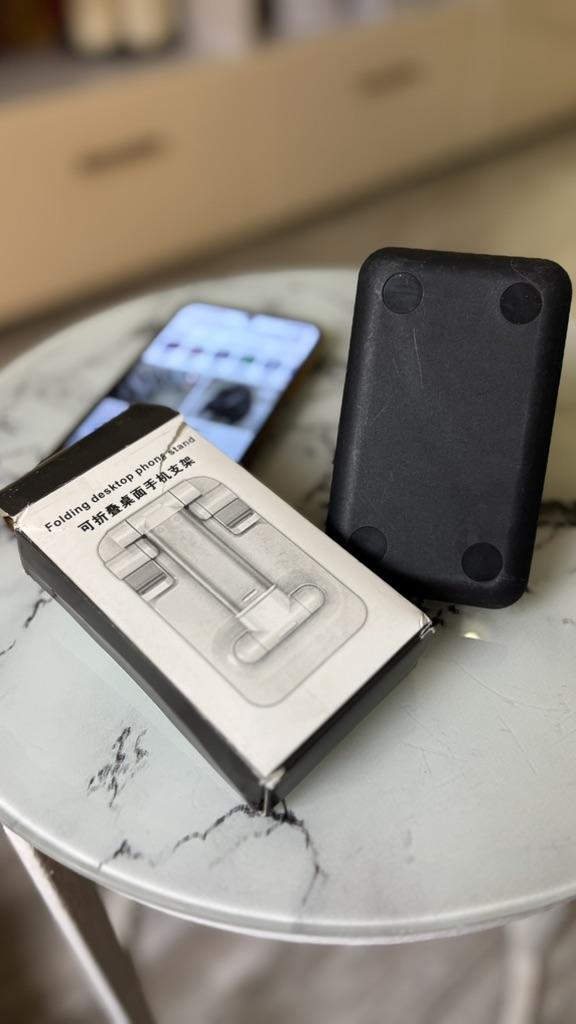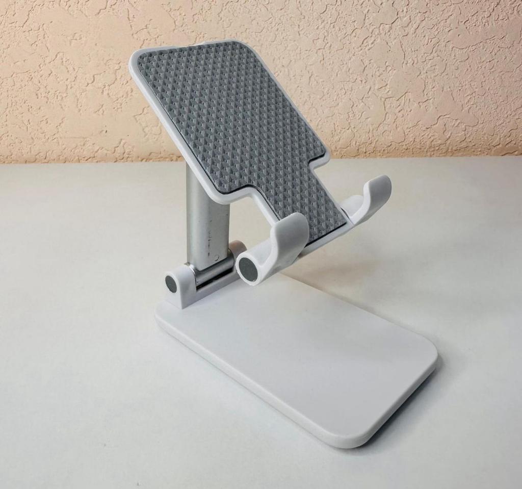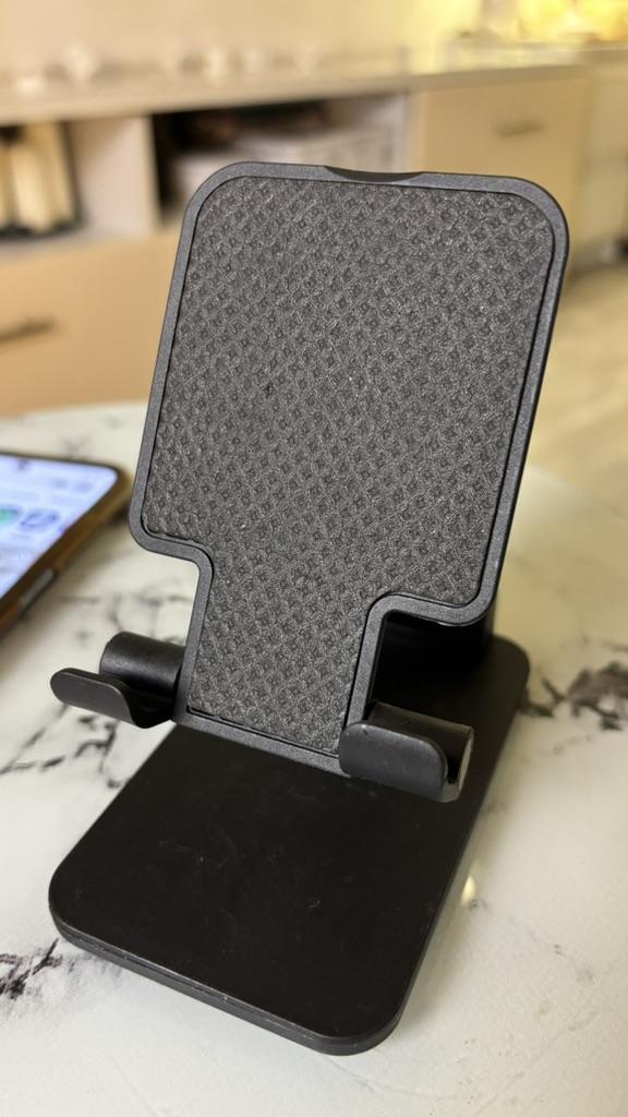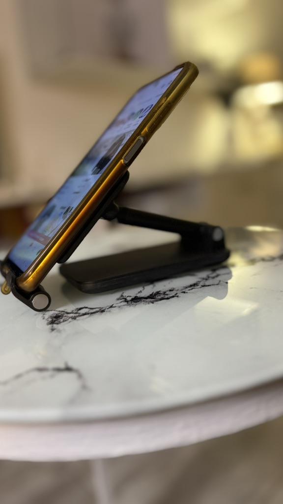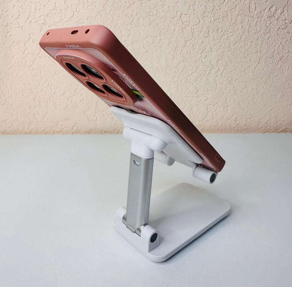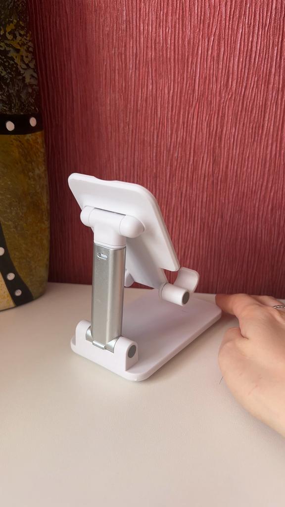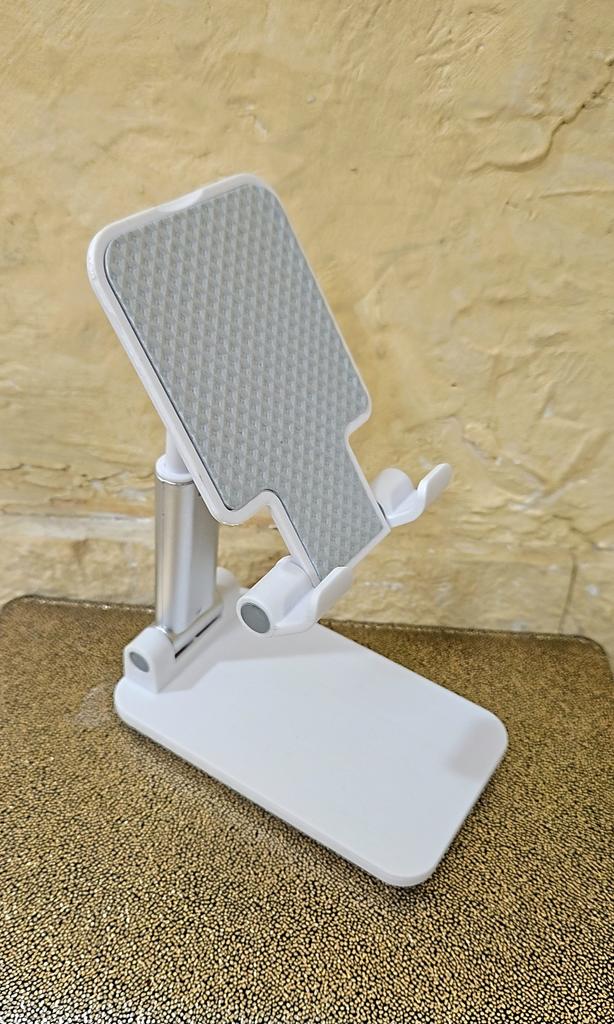Universal Desktop Stand for Phone and Tablet – Convenient, Stable and Practical This table stand is simply a lifesaver! It fits all my phones and tablets, including iPhone and iPad, and the foldable design saves space when not in use. The silicone pad really works and prevents slipping and scratches, so you can rest assured that the device is protected.. What I love most is how stable it is – it really frees up the hands and allows you to watch movies, read emails, or even record video in complete comfort. The increased height is just right for the neck and prevents pain, which is a huge bonus for work and rest.. Very easy to use and organize, and very durable. Highly recommend to anyone who spends a lot of time with their phone or tablet!