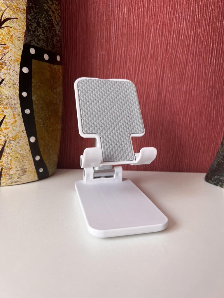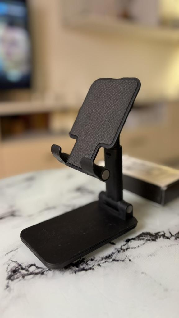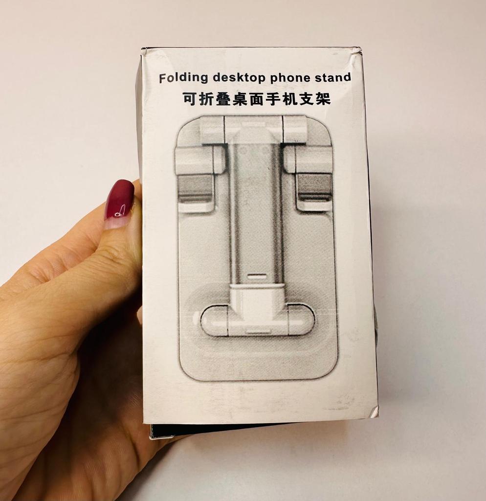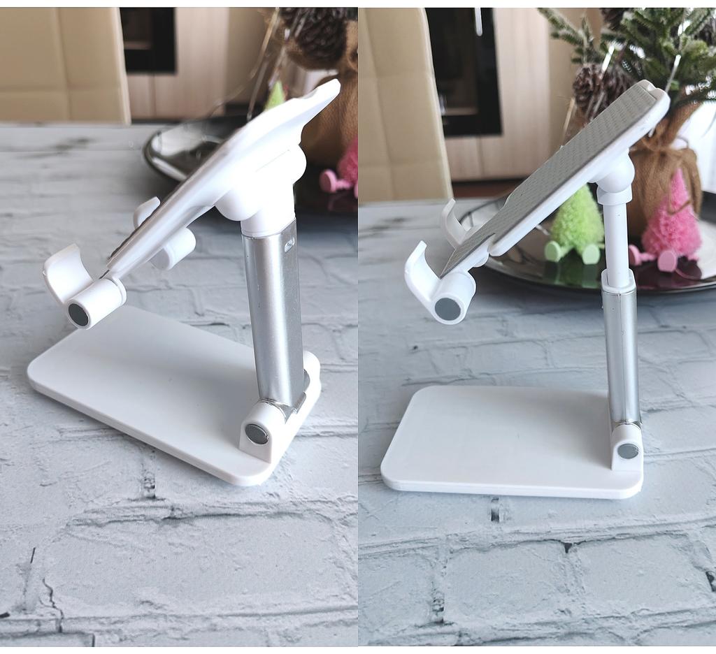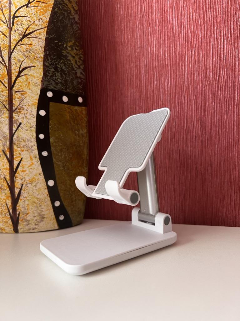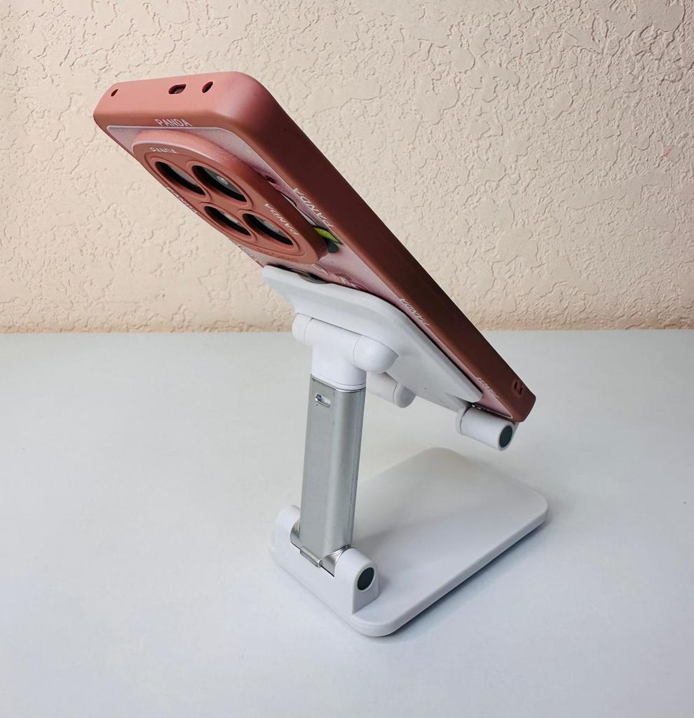 Universal Desktop Stand for Phone and Tablet – Convenient, Stable and Practical This table stand is simply a lifesaver! It fits all my phones and tablets, including iPhone and iPad, and the foldable design saves space when not in use. The silicone pad really works and prevents slipping and scratches, so you can rest assured that the device is protected.. What I love most is how stable it is – it really frees up the hands and allows you to watch movies, read emails, or even record video in complete comfort. The increased height is just right for the neck and prevents pain, which is a huge bonus for work and rest.. Very easy to use and organize, and very durable. Highly recommend to anyone who spends a lot of time with their phone or tablet!