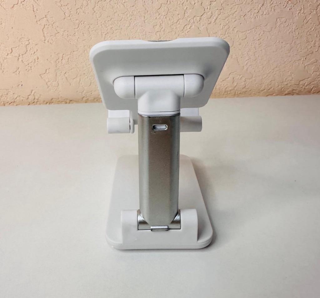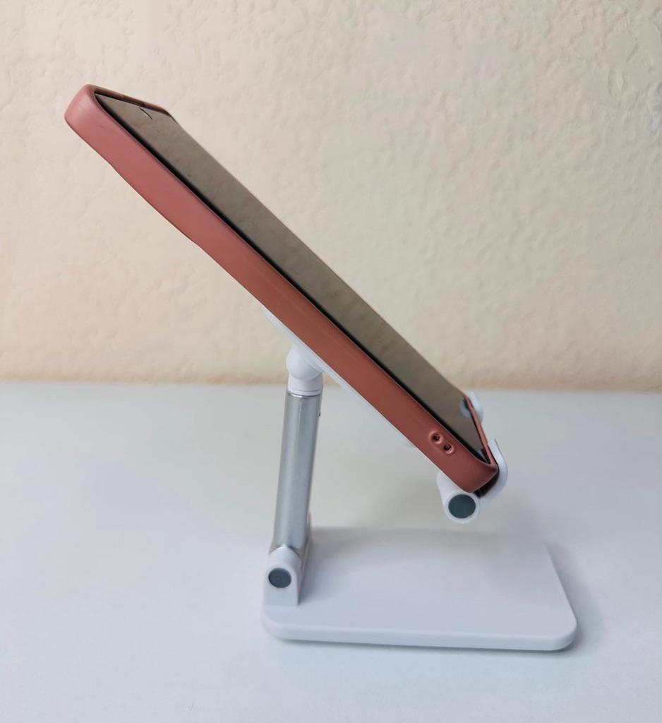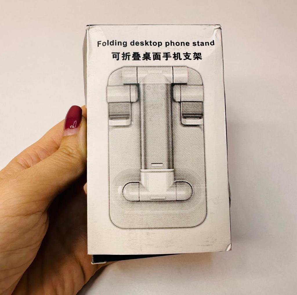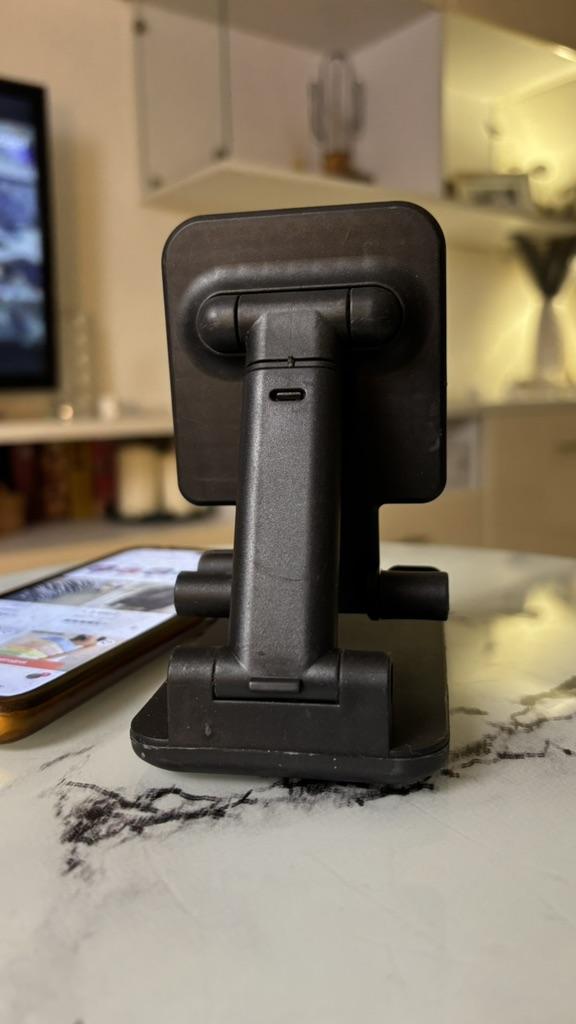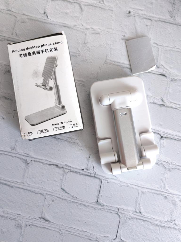 Universal Desktop Stand for Phone and Tablet – Convenient, Stable and Practical This table stand is simply a lifesaver! It fits all my phones and tablets, including iPhone and iPad, and the foldable design saves space when not in use. The silicone pad really works and prevents slipping and scratches, so you can rest assured that the device is protected.. What I love most is how stable it is – it really frees up the hands and allows you to watch movies, read emails, or even record video in complete comfort. The increased height is just right for the neck and prevents pain, which is a huge bonus for work and rest.. Very easy to use and organize, and very durable. Highly recommend to anyone who spends a lot of time with their phone or tablet!