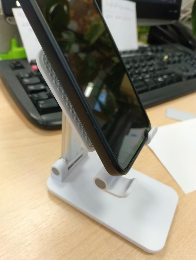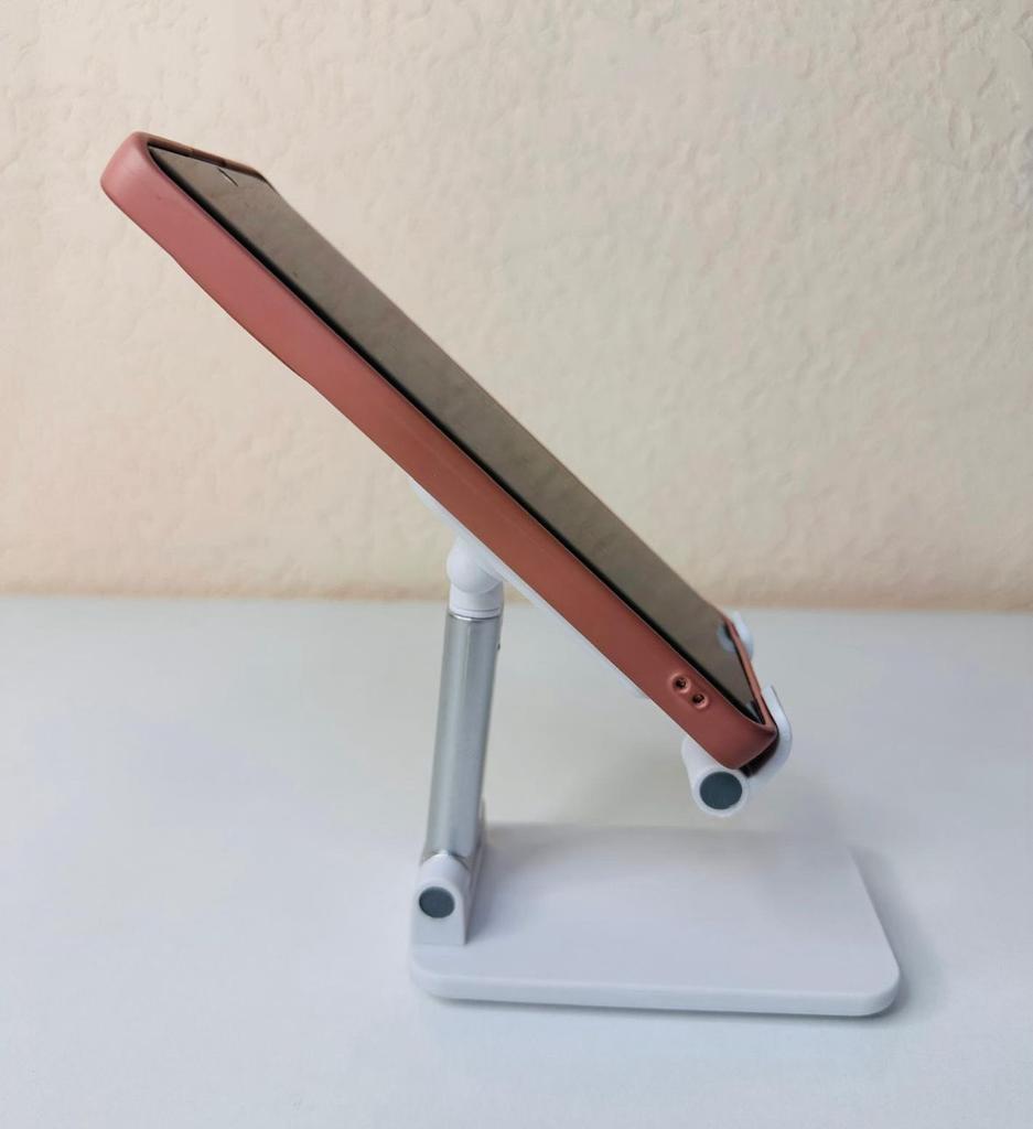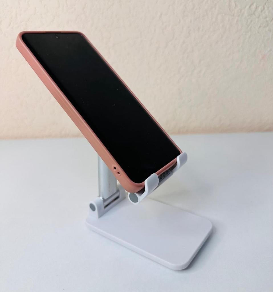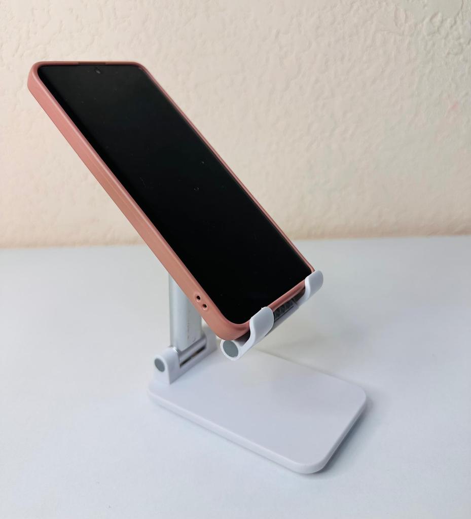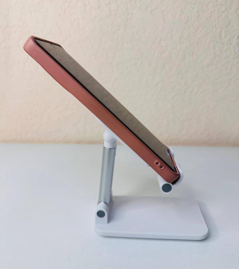 Angle and Height Adjustment: Features a double-hinge system that allows you to adjust both the tilt and height of the device, adapting perfectly to your visual level. Anti-Slip Design: The phone support base has a textured surface that prevents the device from slipping while you use it. Portability: Its structure is foldable, which makes it easy to store in any drawer or transport in a bag when not in use.