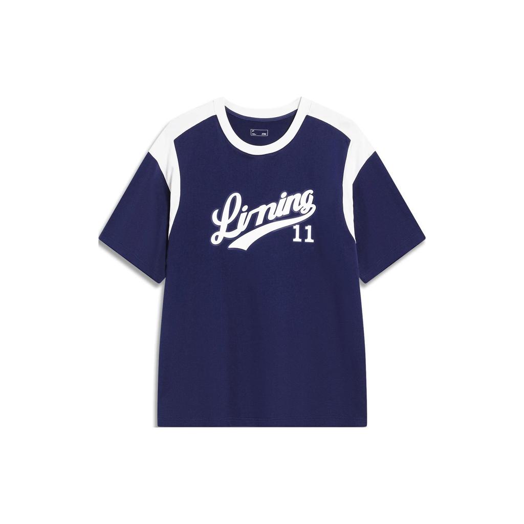 Li-Ning American Vintage Letter Print Color Block Loose Round Neck Short Sleeve T-Shirt Unisex Tops Deep-Pea-Blue AHST855-1