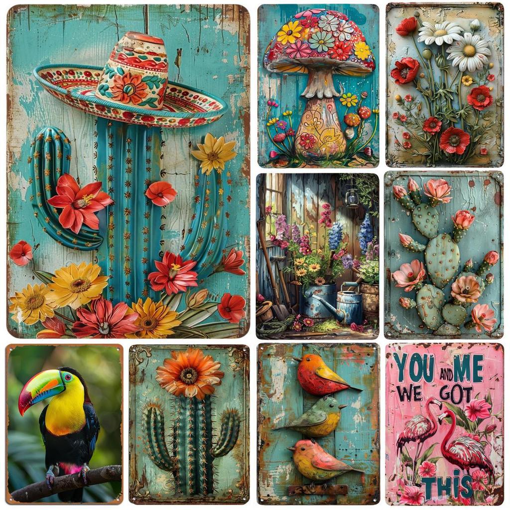 Vintage Bird Cactus Flamingo Metal Tin Sign Wall Art for Home, Bar, Garage & Garden Decor | Easy-Hang Vintage Animal Design