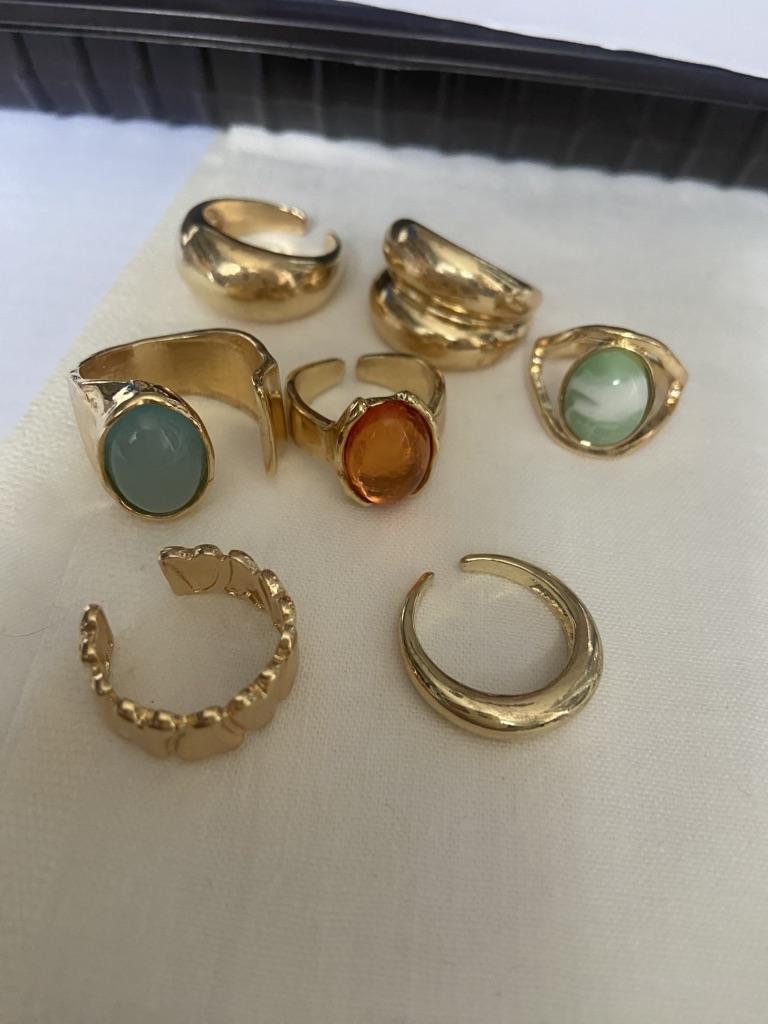 Beautiful. Only the colors of the stones differ. The red one is some kind of dark brown. Instead of blue, it's gray. The sizes are different. Only three rings fit the little finger.