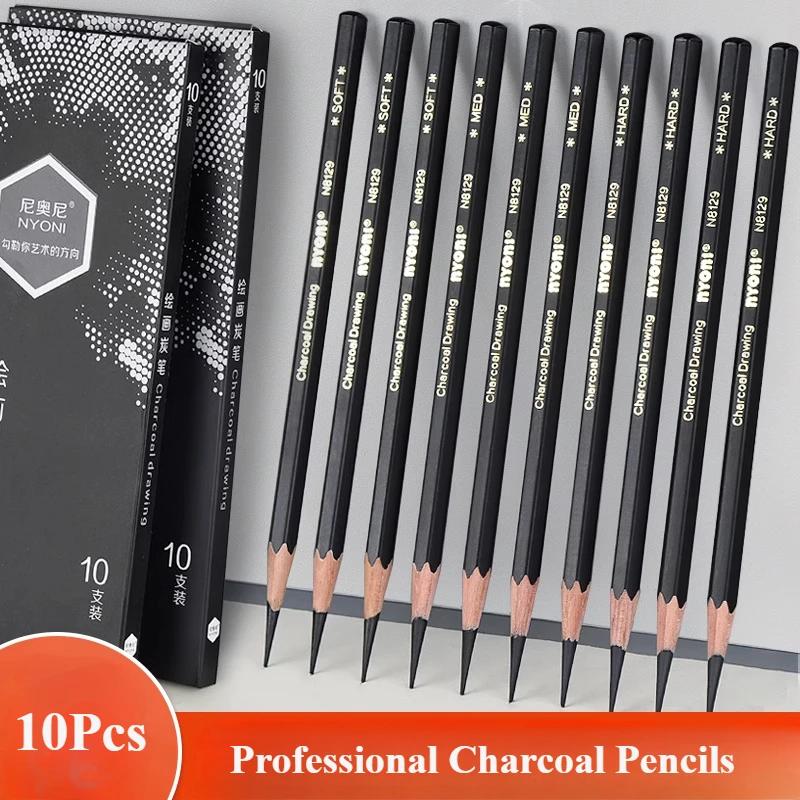 Professional Charcoal Pencils Drawing Set -10 Pieces Soft, Medium And Hard For Drawing, Sketching, Shading, Beginner Artists