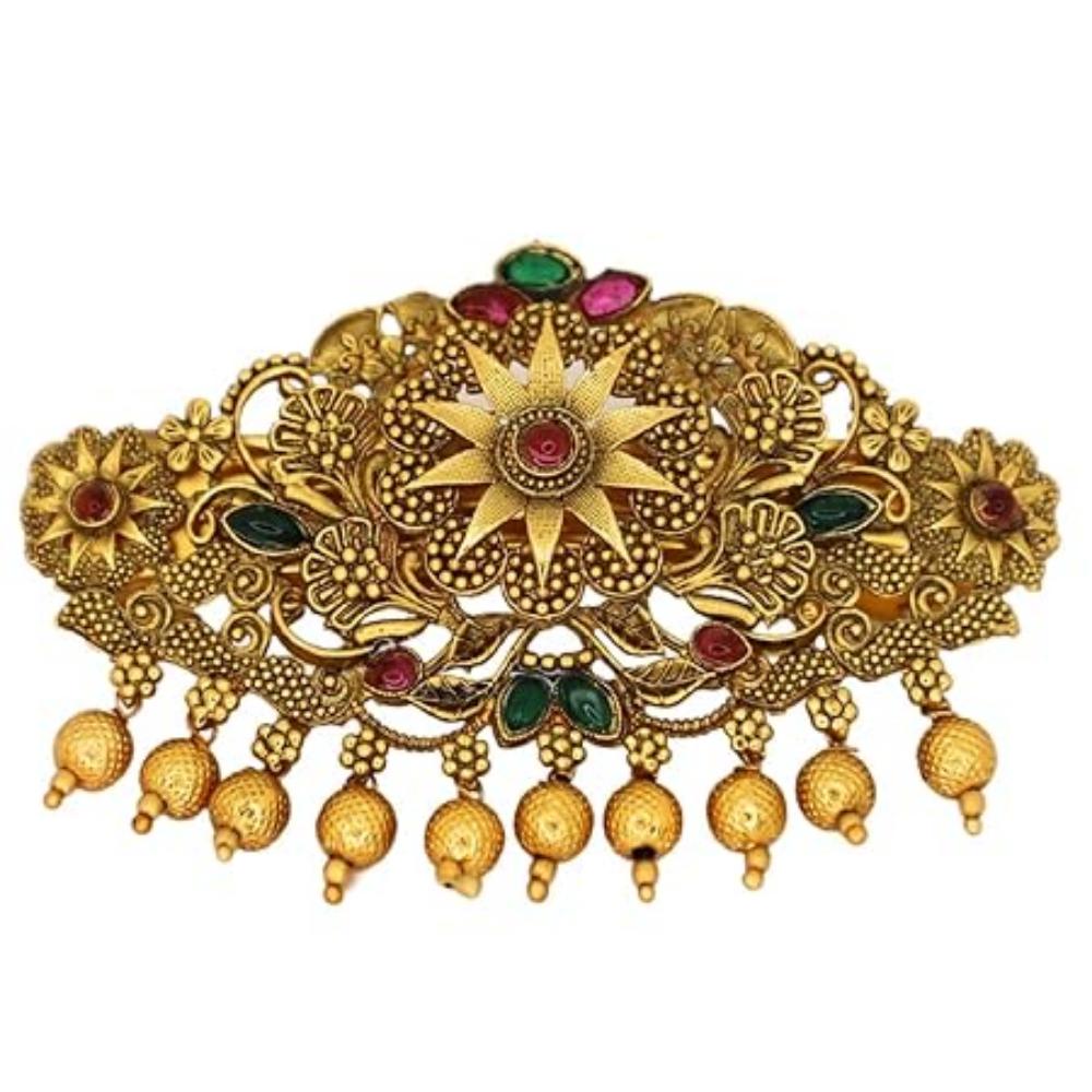 Traditional Gold-Plated Hair Barrette Clip With Floral Design And Beads Danglers (Design-1)
