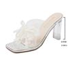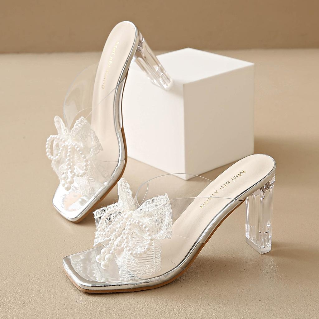 Fashion Summer 2025 Elegant Women's Pearl Bowtie Sandals Thick High Heels Crystal Slippers Woman Square Toe Lace Beaded Gladiator Shoes