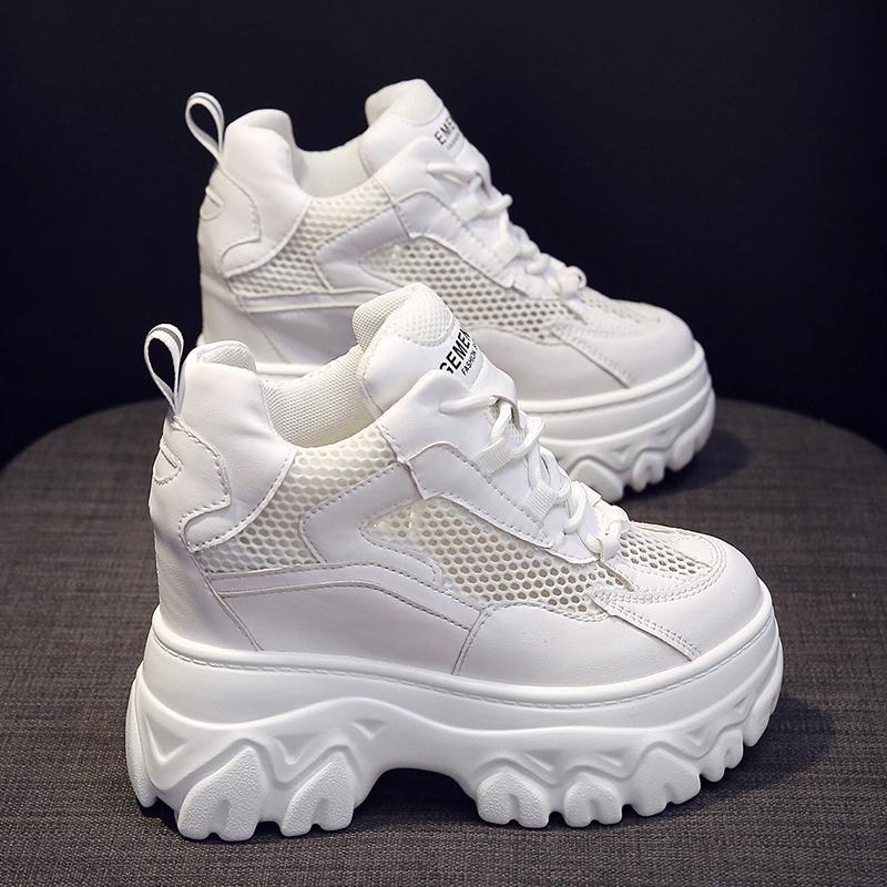 Fashion Hidden Heels White Chunky Sneakers Women Breathable Lace Up High Platform Shoes Woman 10CM Autumn Non-Slip Thick Bottom Sneakers