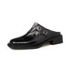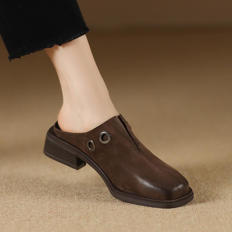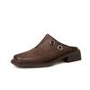 Fashion Elegant Women Summer New Square Toe Cowhide Genuine Leather Slides Shoes Office Ladies Work Med Heels Slip On Loafers Slippers