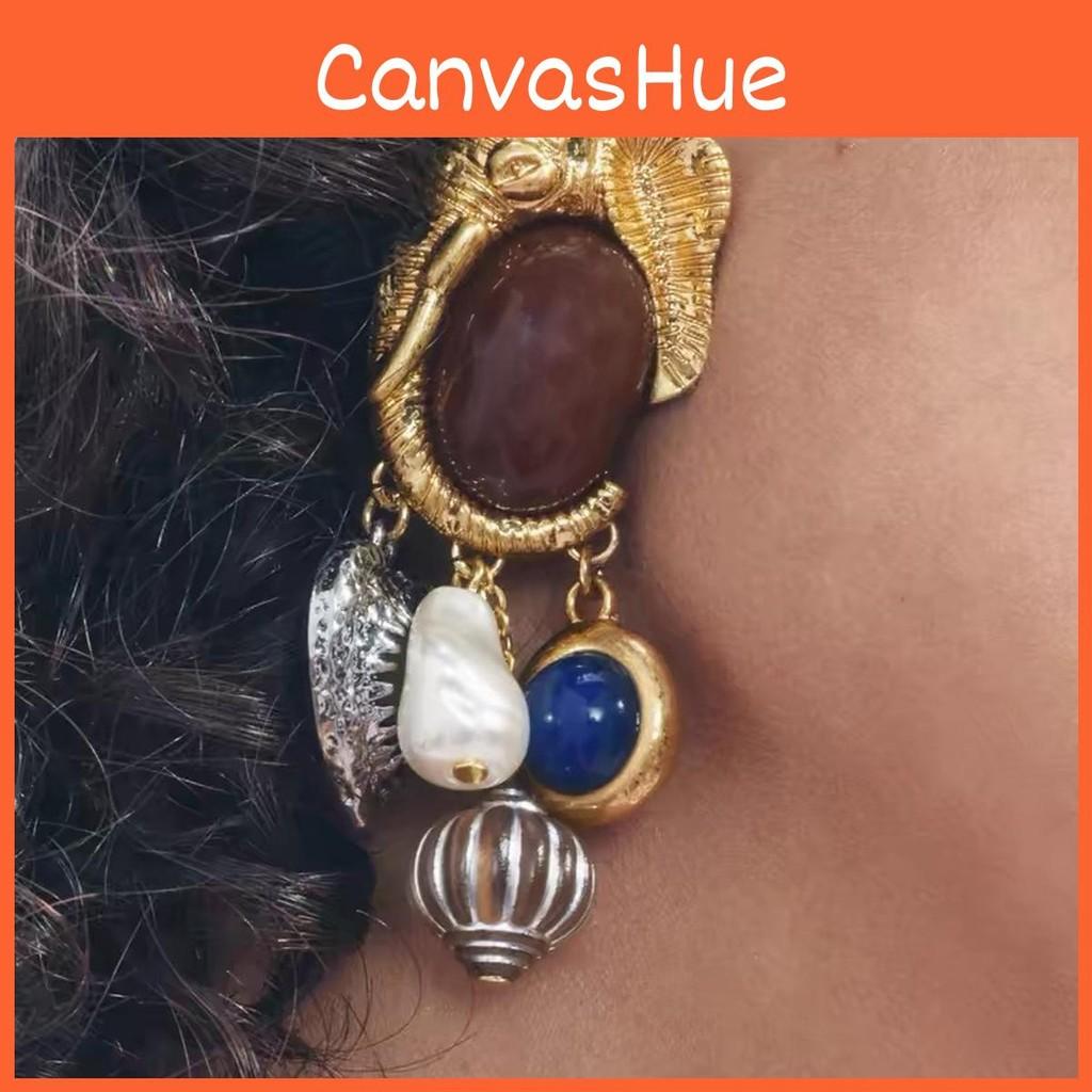 Gemstone Retro Elegant And Faux Pearl Earrings With Unique Shapes Asymmetrical