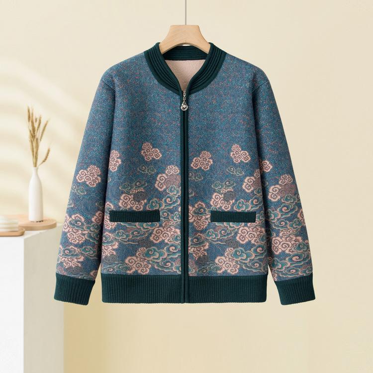 Middle-aged and Elderly Women's Loose Women's Clothing 60-year-old Mother's Spring Coat, Old Lady's Knitted Cardigan Coat and Velvet