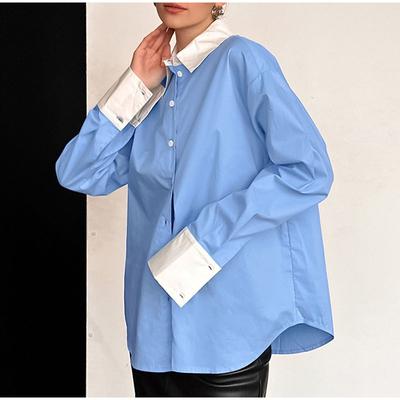 Patchwork Blue and White Lapel Shirts Street Style Women Oversize Long Sleeves Tops Spring Summer 2025 Single Breasted Lady Blouses