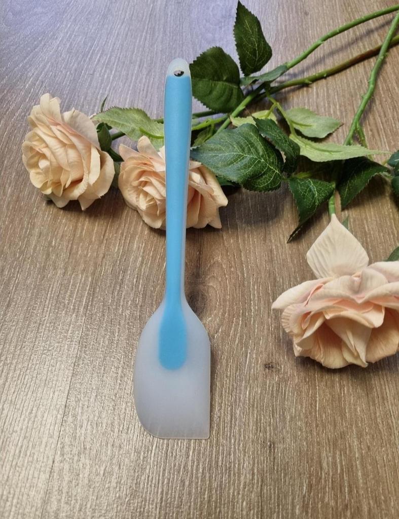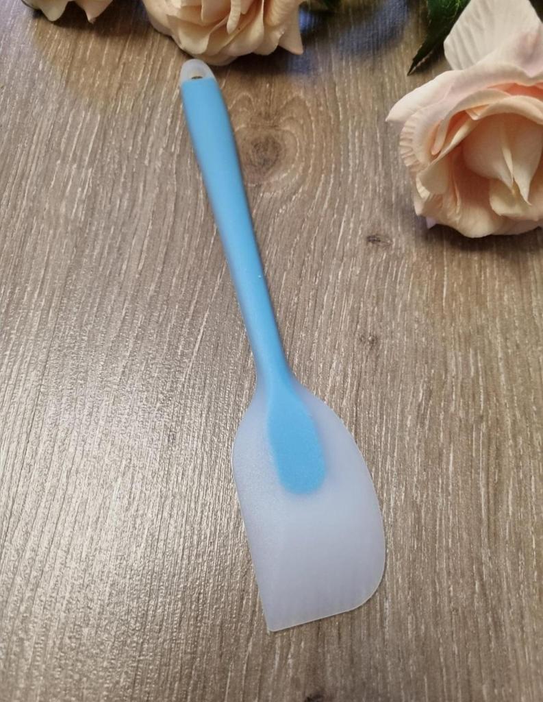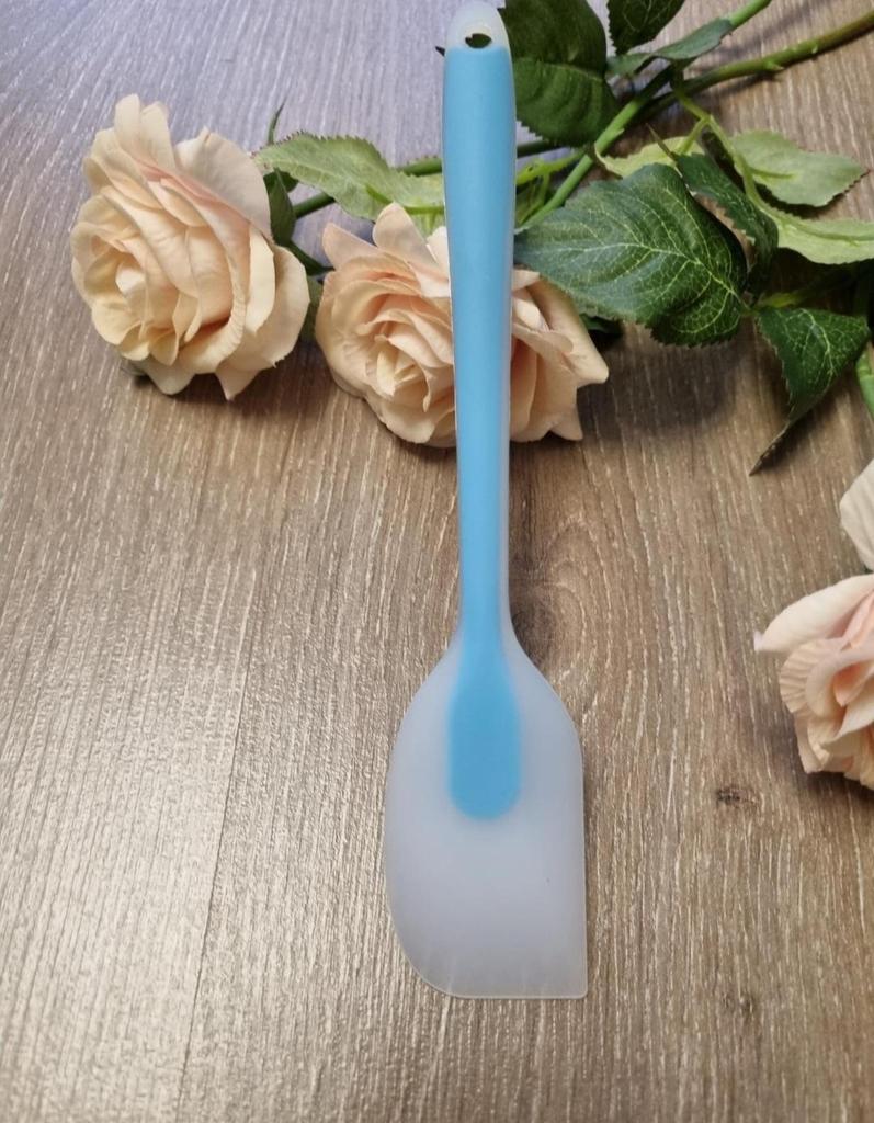 This silicone spatula, in an attractive sky blue color, immediately stands out for its thin and flexible design. It is ideal for pastry tasks that require precision, such as the one seen in the image when spreading whipped cream on a cake. 👍 Strengths: Excellent Flexibility: The silicone head is very malleable, allowing for perfect contact with the surface, whether for smoothing a cream or for scraping up every last drop of dough or mixture from a bowl. Ideal for Pastry: Its shape and flexibility make it perfect for smoothing icings (as seen on the cake cream), guaranteeing a smooth and professional finish. Easy to Clean: The non-stick silicone material makes cleaning easy; does not retain odors or flavors. Comfortable Handle: The handle seems to have a good grip, allowing for firm control even when working with denser mixtures. Visual Appeal: The blue color is a modern and cheerful touch for any kitchen.