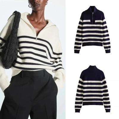 Autumn and Winter New Loose Casual Sweater Women's Semi-zipper Pullover Striped Knitted Sweater Top