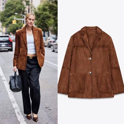 2025 Traf Women's Autumn New Western Style Street Fashion Brown Loose Version Two-button Suede Texture Casual Suit Jacket