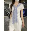 Kumikumi Design Sense White Stripe Lace-up Temperament Short Sleeve T-shirt Women Summer Slim Fit Slimming Versatile Top