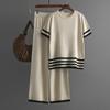 Contrasting Striped Split-ended Short-sleeved Knitted Sweater + High-waisted and Thin Wide-leg Pants and Trousers Fashionable and Casual Two-piece Set