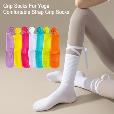 Yoga Pilates Socks with Grips for Women Non-Slip Tie-up Ankle Socks Grippy Lace-up Crew Socks for Barre Ballet Dance