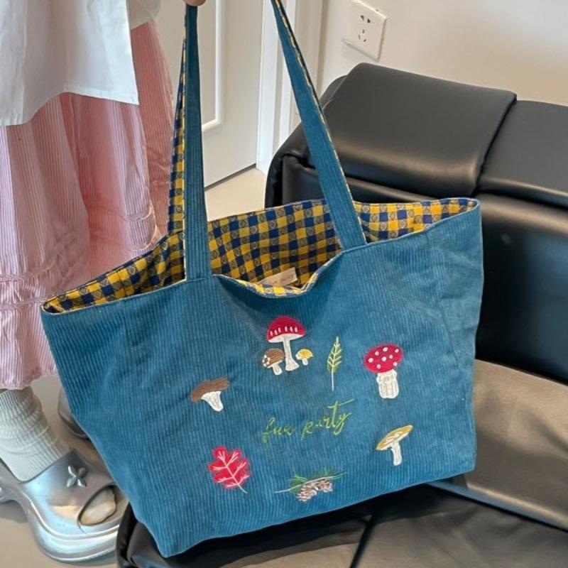 Mushroom Embroidered Shoulder Messenger Bag Corduroy Plaid Double-sided Bag Autumn and Winter New Retro Student Class Bag