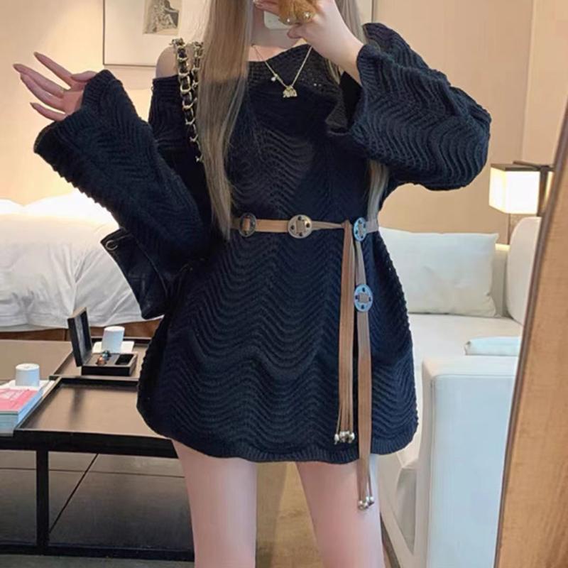 Autumn Plus Women Basic Sexy Sweaters Belt Pullover Tops Loose Female O-Neck Knitted Solid Sweater