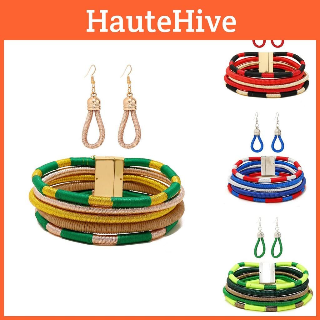 This jewelry set features a bold African-inspired woven choker and matching earrings, crafted from a mixed material with electroplated finishes for durability. The necklace measures approximately 16 inches long with a 2-inch extender, while the alloy pendants showcase celestial and natural motifs like stars, moons, and clouds. Suitable for casual or festival wear, the set enhances personal style with its intricate knot design and vibrant color options. Maintain by wiping gently with a damp cloth to preserve the electroplated surface.