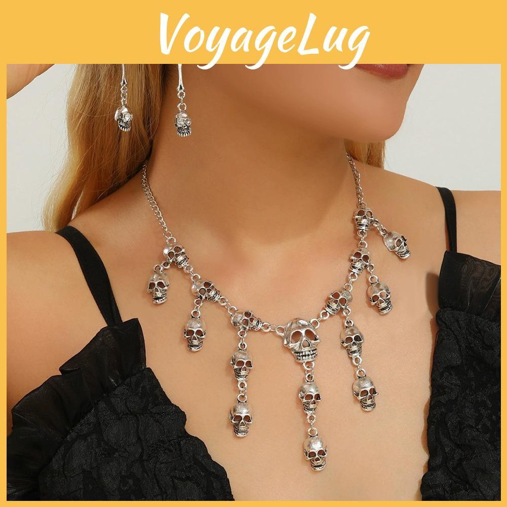 This Halloween jewelry set features a punk-inspired vintage design with alloy skull pendants and tassel earrings, combining gothic style with a bold look. The alloy materials are electroplated in antique gold or silver, measuring approximately 2 inches in length for the necklace. Ideal for costume parties or themed events, the set supports easy wear and maintenance with a simple wipe-clean process.