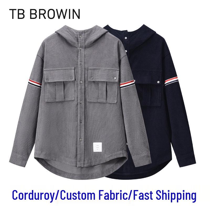 Introducing a stylish and versatile corduroy hooded jacket designed for the modern man. This medium-thickness outerwear features a trendy plaid pattern, offering both comfort and warmth as the seasons change. Crafted entirely from premium corduroy, it exudes sophistication and durability. The jacket boasts long sleeves and a striking combination of red, white, and blue stripes, adding a pop of color to any outfit. Whether you're heading to a casual outing or a more formal gathering, this jacket is a perfect addition to your autumn wardrobe.