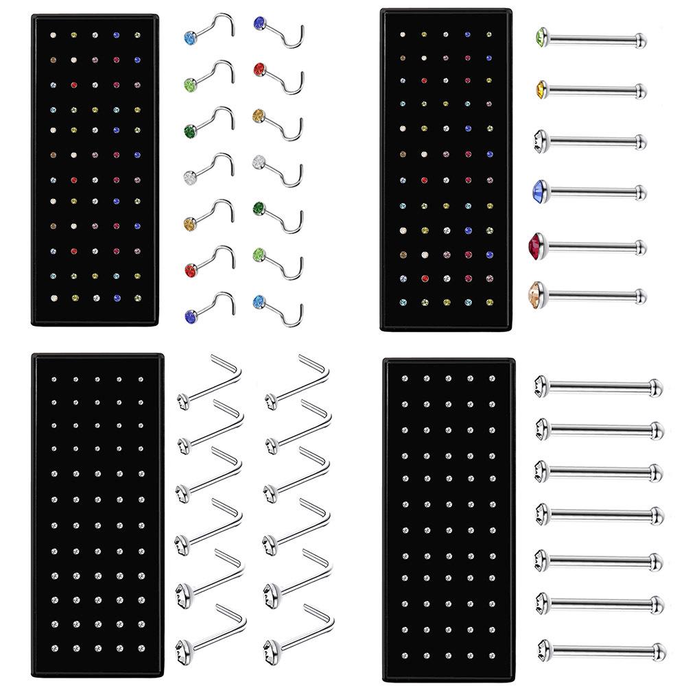 60 Stainless Steel L-Shaped Nose Studs (1.5/2.0/2.5mm) with Diamond Inlay Curve Nose Rings