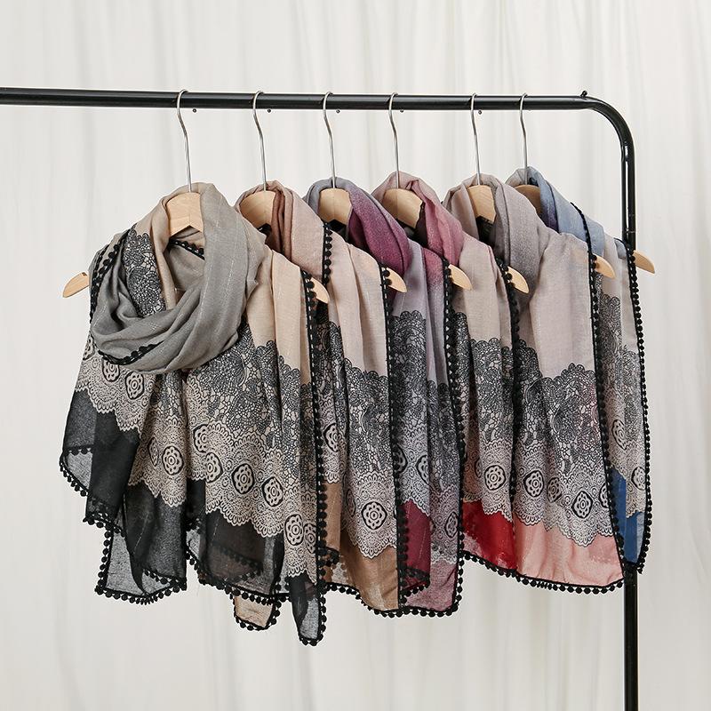Winter Aztec Lace Floral Pom Pom Cotton Viscose Shawl Scarf Lady High Quality Wrap Pashmina Stole Bufandas Muslim Hijab 180*90Cm