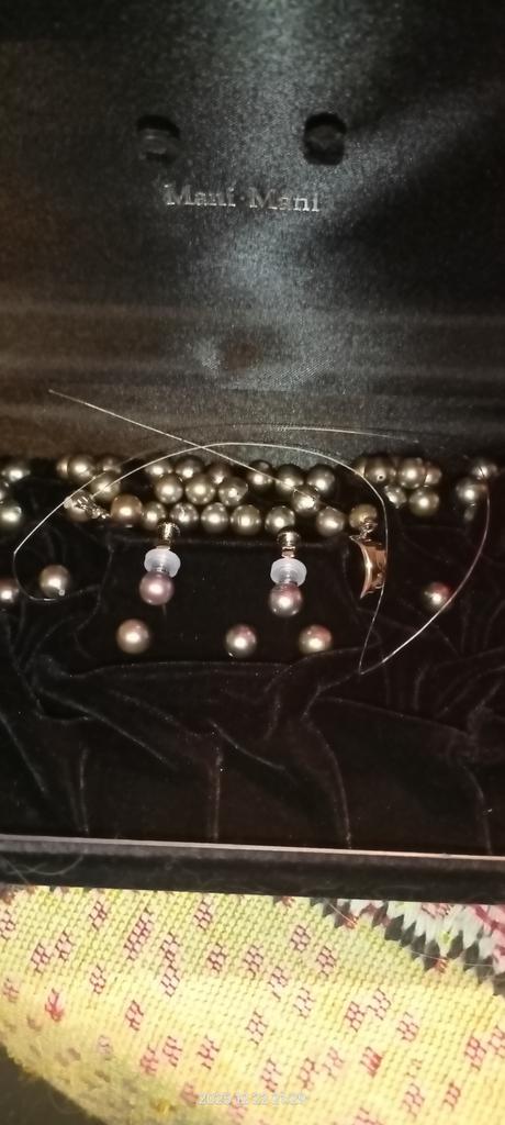 This is a necklace set made from natural Akoya black pearls, an increasingly rare material produced from living Akoya pearls in the ocean.
