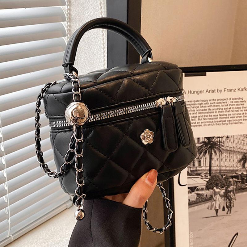 - **Structured Multi-Way Bag Details**: Features a stylish mini box bag silhouette with PU material, quilted finish, metal hardware accents, a top handle, and an adjustable chain shoulder strap. It exudes luxurious and cute charm, available in two sizes (Large & Small) and three vibrant color options (Beige, Silver, Black) to cater to diverse style preferences.