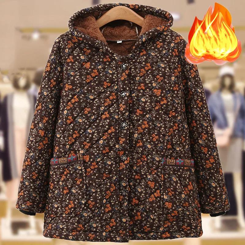Women's Winter Plus Size Fleece-Lined Warm Coat Hooded Casual Jacket for Middle-Aged and Elderly Women
