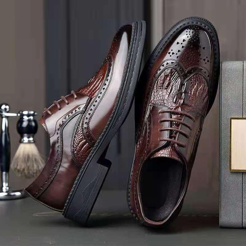 Men's Shoes Breathable Leather Shoes Men's Genuine Leather Business Dress Block Engraved Groom Wedding Shoes Gentleman Height Increase