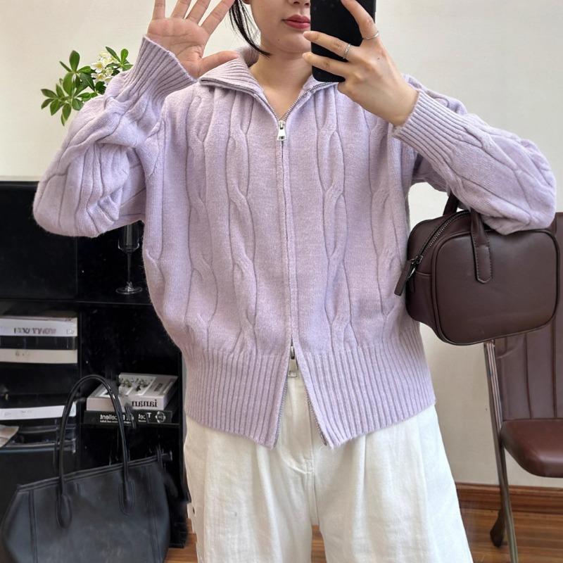 Autumn Winter Stand Collar Fried Dough Twist Zipper Knitting Coat Women Casual Fashion Cardigan Sweater Top