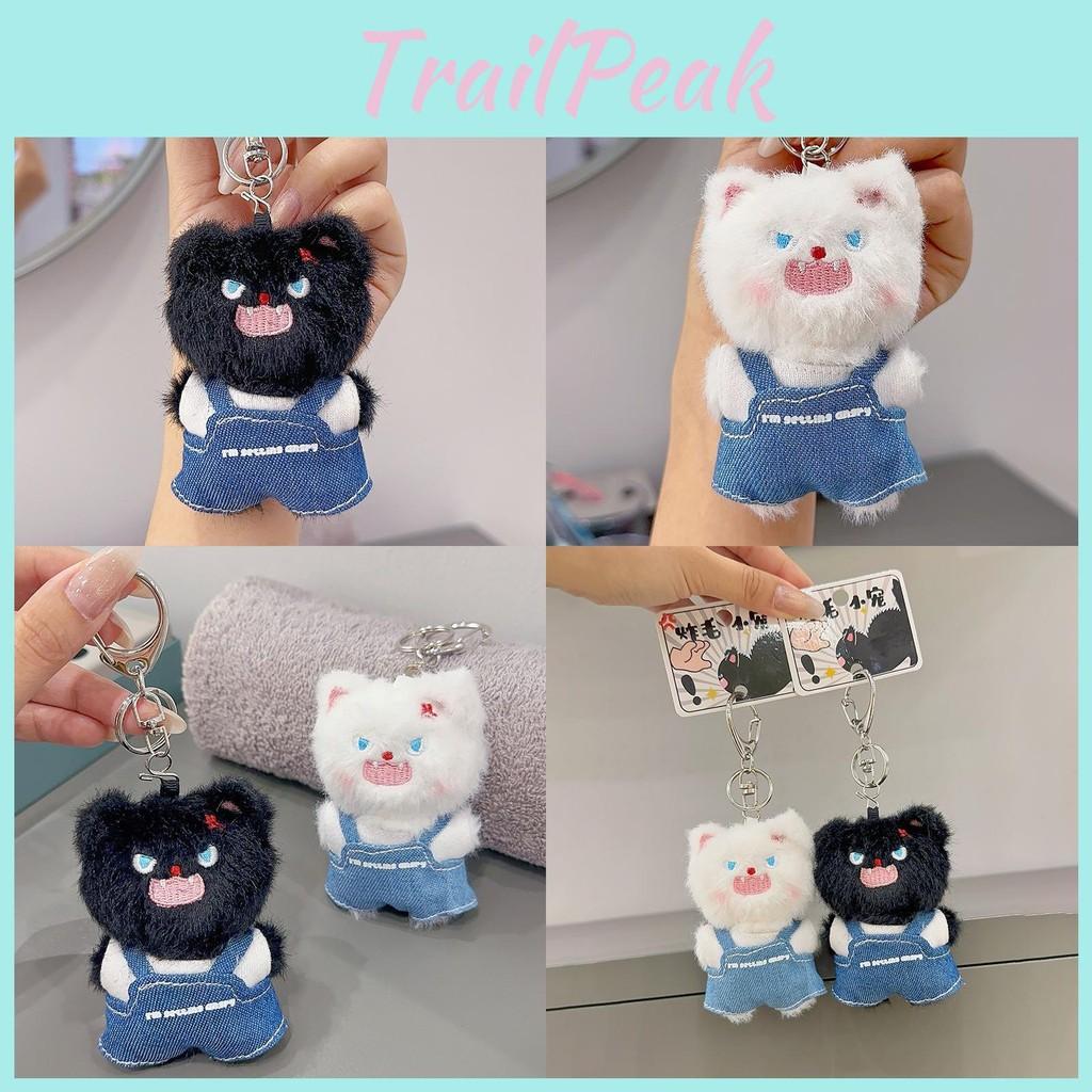 This plush keychain features a cute cat character dressed in denim overalls, crafted from soft, durable plush material, it provides a tactile and charming accessory for daily use. The keychain is available in black and white, perfect for personalizing bags or keys.