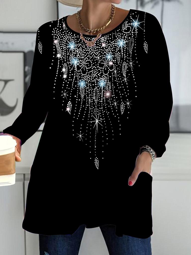 2025 Autumn Winter New Plus Size Women's Tops, Flash Diamond 3D Print Fashion Crew Neck Long Sleeve T-Shirts